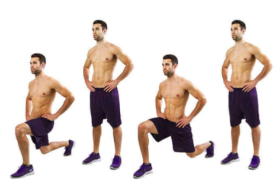 한쪽 다리를 앞으로 내밀고 양쪽 무릎이 약 90도 각도로 구부러질 때까지 엉덩이를 낮춥니다. 뒤쪽 무릎은 땅 바로 위에 있어야 합니다. 다시 시작 위치로 밀고 반대쪽도 반복합니다.