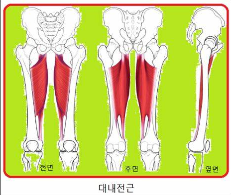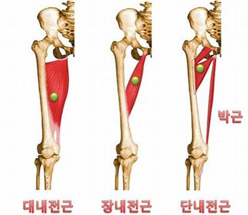 - 내전근: 내전근근, 내전근단근, 내전근장근, 유연근, 외측회전근이 포함되며, 허벅지의 내전을 담당합니다.