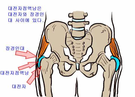 점액낭은 움직이는 구조물 사이의 마찰을 줄이는 작은 액체로 채워진 주머니입니다. 엉덩이 주변에는 대퇴골 결절 점액낭, 좌골 점액낭 등 여러 점액낭이 위치해 있어, 근육과 힘줄이 뼈 위에서 움직일 때 쿠션 역할을 합니다.