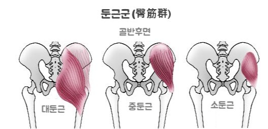 - 둔근: 대둔근, 중둔근, 소둔근을 포함하며, 고관절의 신전, 외전, 회전을 담당합니다.